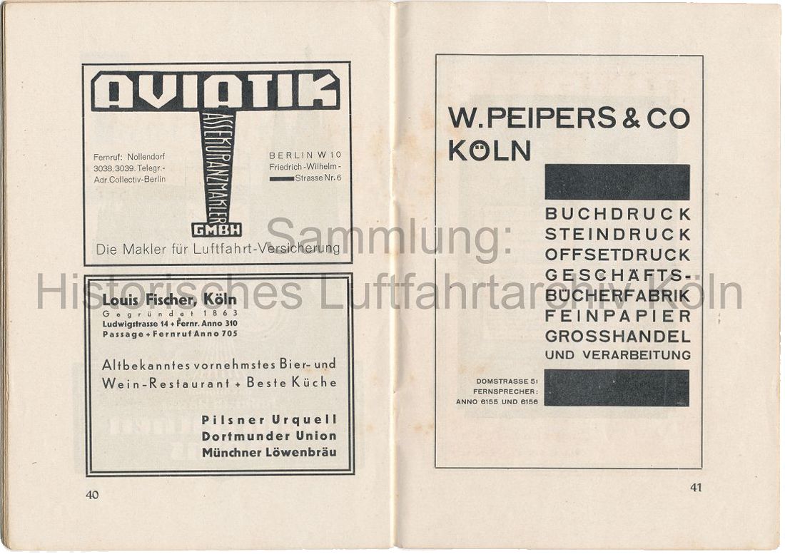 Im Programmheft wurde auch eine Art "Bedienungsanleitung für Flughäfen" mitgeliefert. Dabei darf man nicht vergessen, dass der Kölner Flughafen Butzweilerhof mal gerade 14 Monate alt war. Aber auch ein ausführlicher Artikel befasste sich mit der Entwicklung der kommerziellen Luftfahrt und beschreibt ausführlich die Vorteile. Der erste Flugtage des Flughafen Butzweilerhof erregte große Aurmerksamkeit. Alleine im Ehrenausschuss sind 41 Namen aus den Bereichen Politik und Verkehr verzeichnet - angeführt von Oberbürgermeister Adenauer. Aber auch Vertreter der Wirtschaft waren im Ehrenausschuss. Interessanter Weise war keine Frau dabei. Natürlich gab es auch Preise für die Wettbewerbe. Dazu gehörten:
