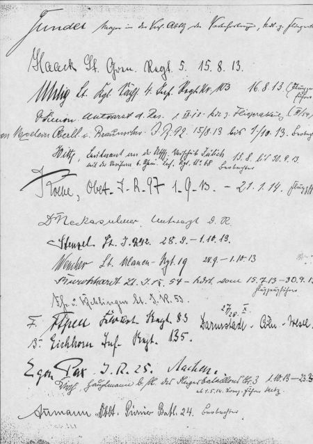 Stiewe Haupt Schweickhardt Konnäzky I.R.48 vom 1.11.13 - Behrenz, Lt. Füs.Rgt.Graf Roon (vom 1.10.13 - Meyer Füs.Regt.39 vom 8.10.13 - E.v.Mepelein Inf.Reg.92 als Beobachter ab 15.2.1914-15.6.14 Collmann von Schatteburg Lt.Inf.Regt.167 (vom 30.9.13 - v.Siegler u.Wipphausen Lt.I.R.z.Pf.2 .1.11.14 - C.Menge Feldart .Reg .58 als Beobachter ab 2/2.1914 - Rohdewald Zech ? I.R.31 (vom 1.2.1914- 2.8.1914) Flugzeugführer 1.R .79. kmd t . v .1.11.13 - 1.6.14 Flugzeugführer Hantsch I.R.161 (vom 1.11.1913 - Paarmann P.B.21 vom 1.2.14 - 1.7.14 Gettesink Oblt. Art 0 15/X.13 - 1.6.14 Flugzfhr. Wentzel INutnant Fuß Art.20 26./X.13 - 1.7.14 **, Rapmund ? Leutnant P.B.9 vom 1.2.14 - 1.7.14 Kleine ? Leutnant I.R.65 -v.1.2.14 ab.- Heising Leutnant I.R.15 -v.1.2.14 ab.- Junpershausen ? Leutnant I.R.96 -v.21.2.14 ab-Kastner Oblt.u.Adju. Fl.Bt1.3 #, 1Yical4XXXX?, Oblt.,Führer der Fliegerstation Wahn Niemöller * siehe auch zweite Unterschrift auf Blatt 3 und 207,23 +, siehe auch auf Blatt 24 # siehe auch auf Blatt 20,44 ** siehe auch auf Blatt 22 |