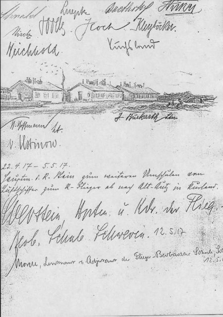 Zeichnung: Luepke? Baethok? Nickel? Fooltz? Koch Kleyböcker. Vuchsland? - Dargestellt sind hier wahrscheinlich die 3 Baracken, im südlichen Bereich des Flugplatzes, die auf dem Foto Nr.M 82/3A zu sehen sind. In diesen Baracken müssen die Teilnehmer des 2.1etrsus der Flieger Beobachter Schule Köln untergebracht gewesen sein.(siehe Überschrift dieses Abschnitts auf Blatt 46; ? . Hoffmann Lt. J.Burkarth Ltn. *) #) - v.Ustinow 22.4.17 - 5.5.17. Hauptmann d.R.Stein zum weiteren Umschulen von Luftschiffer zum R-Flieger ab nach Alt-Autz in Kurland. Eberstein?, Hptm.u.Kdr. der Flieg.- Beob.Schule Schwerin. 12.5.17 Morell, Leutnant & Adjutant der Flieger-Beobachter Schule Schwerin 12.5.17. *) siehe auch auf Blatt 46 R-Flieger = Riesenflugzeugführer #) Zeichnung von Burkarth • // siehe Fotos M 52 (55) |