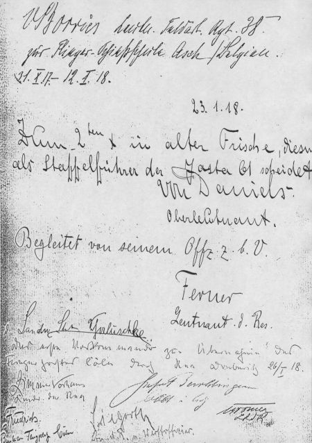 Baa/sch, Leutnant im Flls.=Rgt.v.Steinmetz 37 vom 14.9.ab. kdt.zur Beobachterschule der Fea.7., vom 1.10.ab versetzt zur Beobachterschule Warschau. 19.5.16 - 25.9.16 In dankbarer Erg.an mein schönstes Commando. .? Lenz Unterarzt 12.2. - 20.9.16. Meinecke Hptm.u.Adj.Fea 7 30.9.16. Schleth Leutn.u.Beobachter.Flieger Abt.48. 5.X.16. Biesel, W.? Leutunt d.Res. K.E.St.Köln Schulte Ltn.u.Flugleiter der Kes der Fea 7. Herzlichen Dank. 10/10.16 13/10.16 Schreiber, Oblt.i.2.Gardefußa Rgt von Afa 205, kdrt.zur Fea 7. 20.9.16. Zentzminierski? Lt.d.R. Fea 5 kdrt.zur K.E.St.Köln zur K E St 4 versetzt. Wiehle, Lt.d.R. RIR 72 Flugschüler Mai - November 1916 Crefeld - Cöln Artur Fischer I.R .87 von Fea 9 zu Fea 7. **) *) K.E.St.oder Kes = Kampfeinsitzerstaffel oder Kampf-Einsitzer-Schule **) RIR = Reserve Infanterie Regaiment |