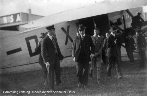 ![]() Der Oberbürgermeister der Stadt Köln, Konrad Adenauer, mit Familie zu Besuch auf dem Flughafen Köln Butzweilerhof. In seiner Position im Aufsichtsrat der neuen Luft Hansa bewies er großes Interesse an der neuen Luftfahrt. Hier mit seiner Frau Gussi, seinem Sohn Max Adenauer (dem späteren Oberstadtdirektor von Köln) sowie seiner Tochter Ria. |