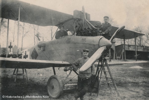 ![]() Das Monteurteam mit dem 1. Wart Unteroffizier Leo Müller, dem II. Monteur Gefreiter G. Scheller und dem III. Monteur Heinz Schnegelberg vor einer DFW C.V.. Rechts im Hintergrund ist eine Flugzeughalle zu sehen. Der Standort ist unbekannt. |